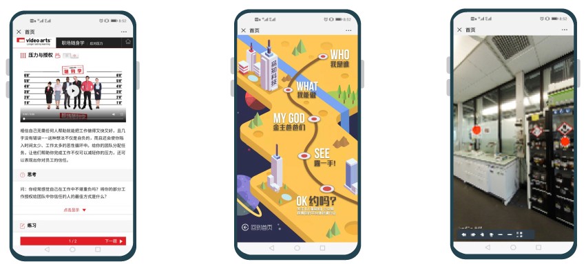 互动形式主要有:Scorm课件、自定义活动和VR场馆。逻辑清晰,场景化,能充分调动学员的积极性。